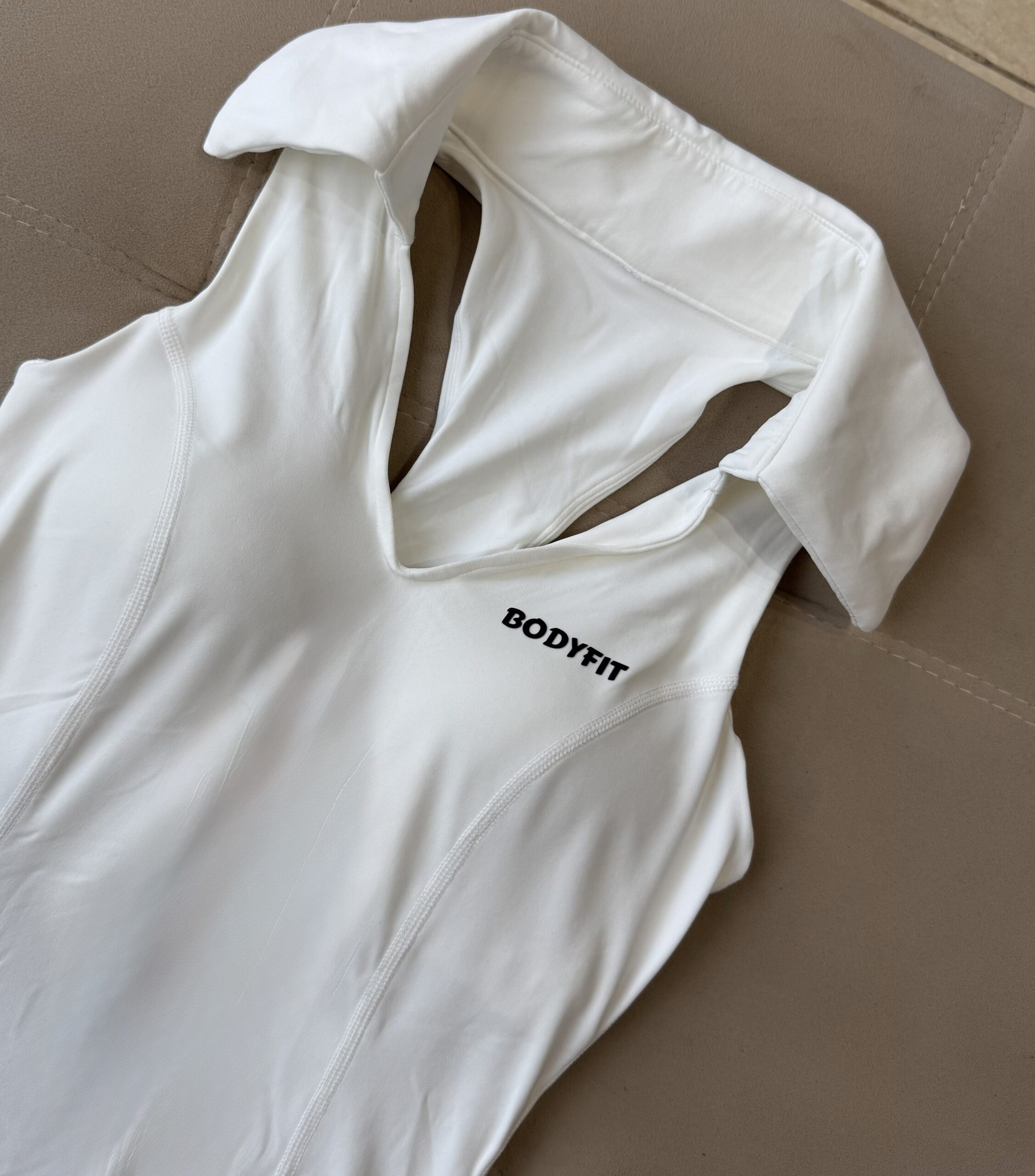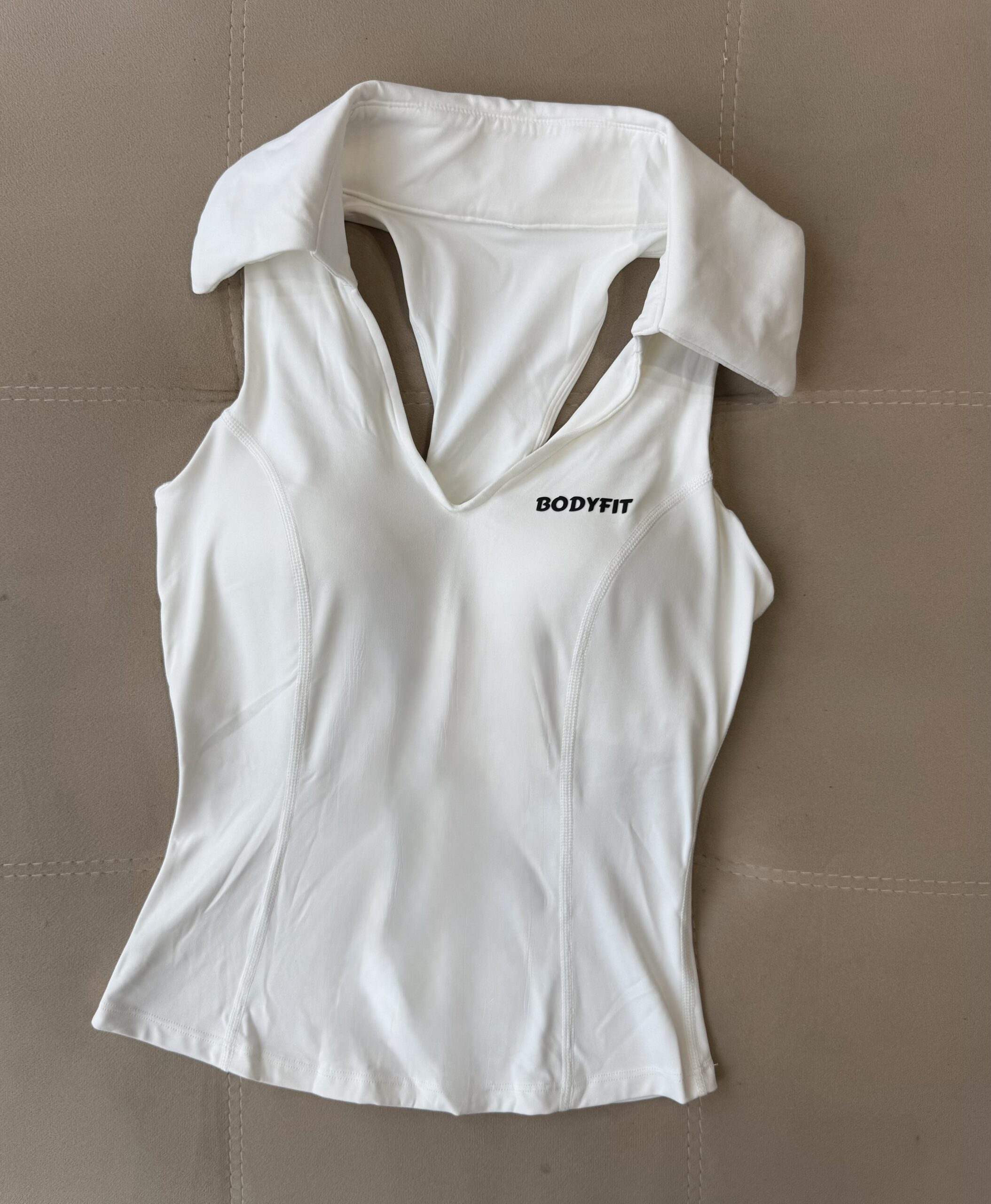 Chomba en color blanco esencial con escote en V, tazas desmontables y calce cómodo. Un básico versátil para entrenar o usar todos los días con estilo. 🤍✨