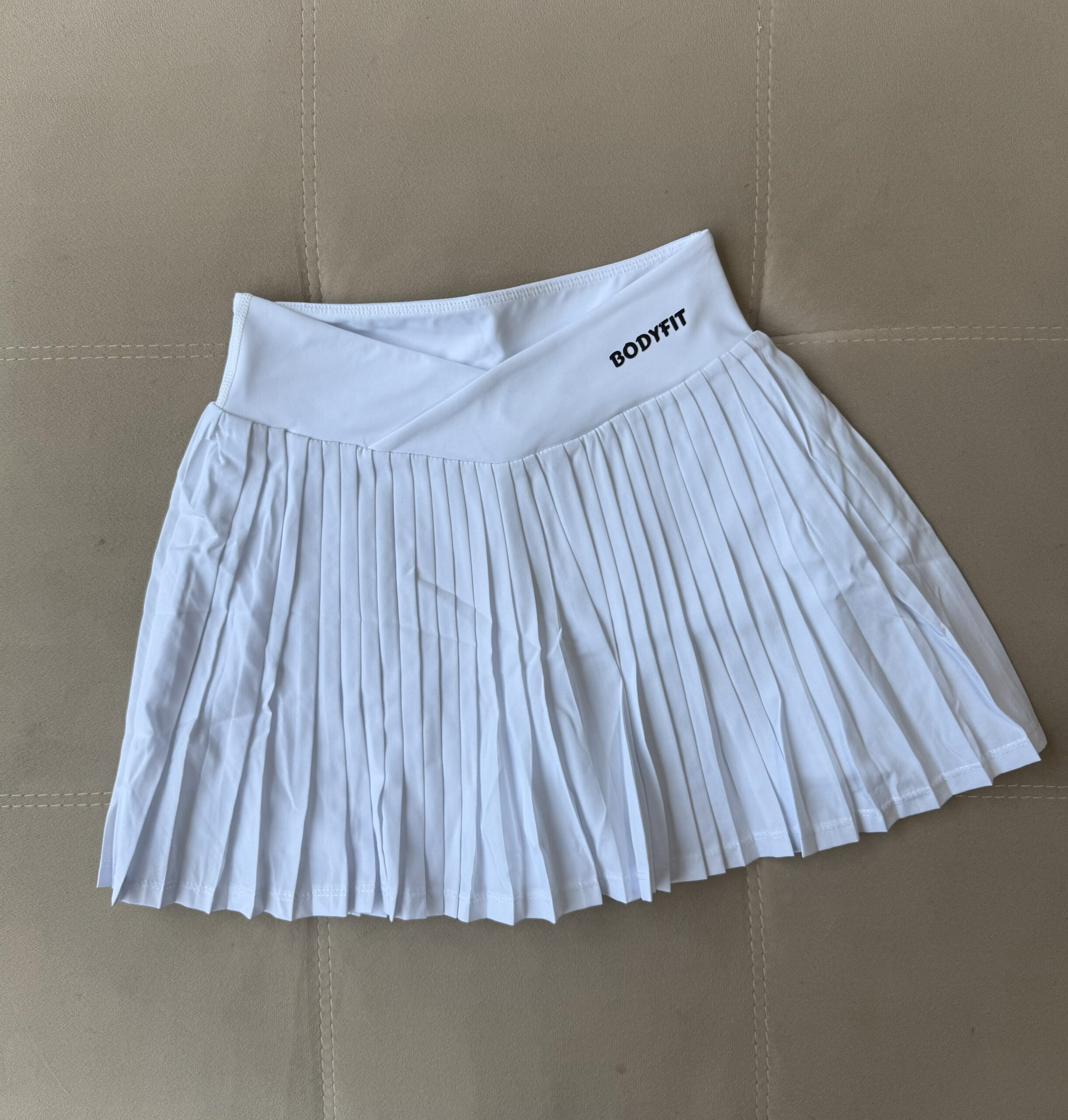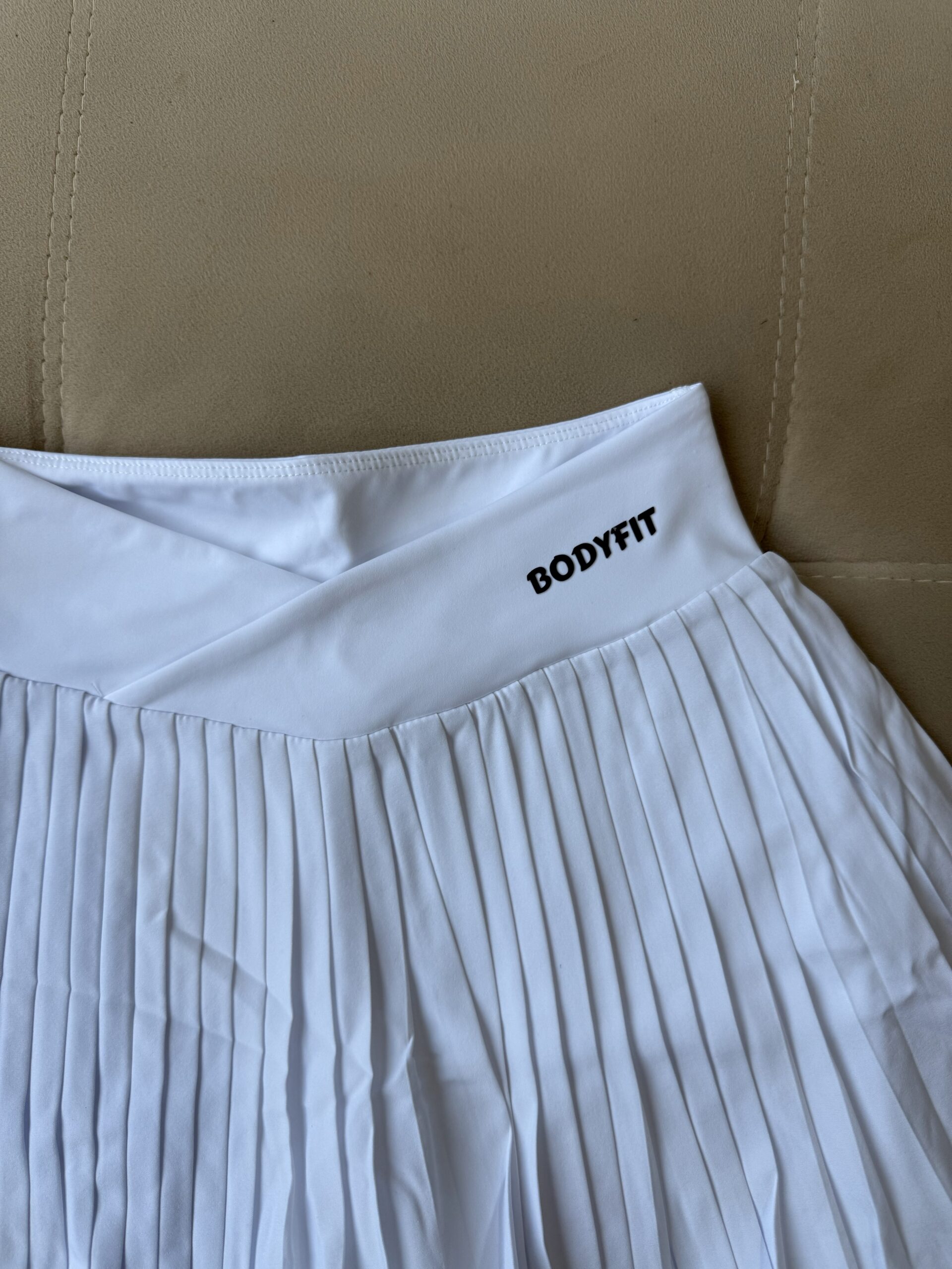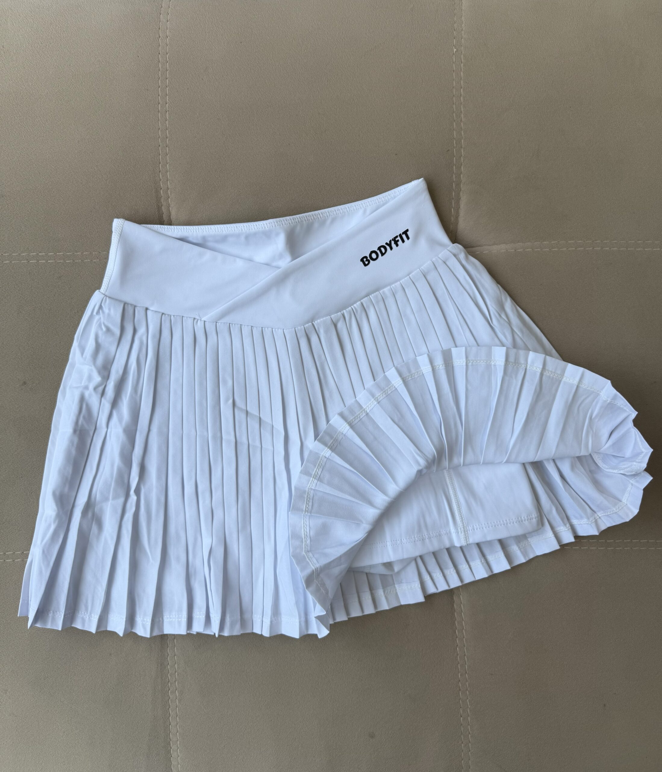 Pollera tableada en blanco esencial, con cintura de corte en V que estiliza la figura, calza interna cómoda y un bolsillo lateral funcional. Ideal para entrenar o usar en el día a día con estilo.