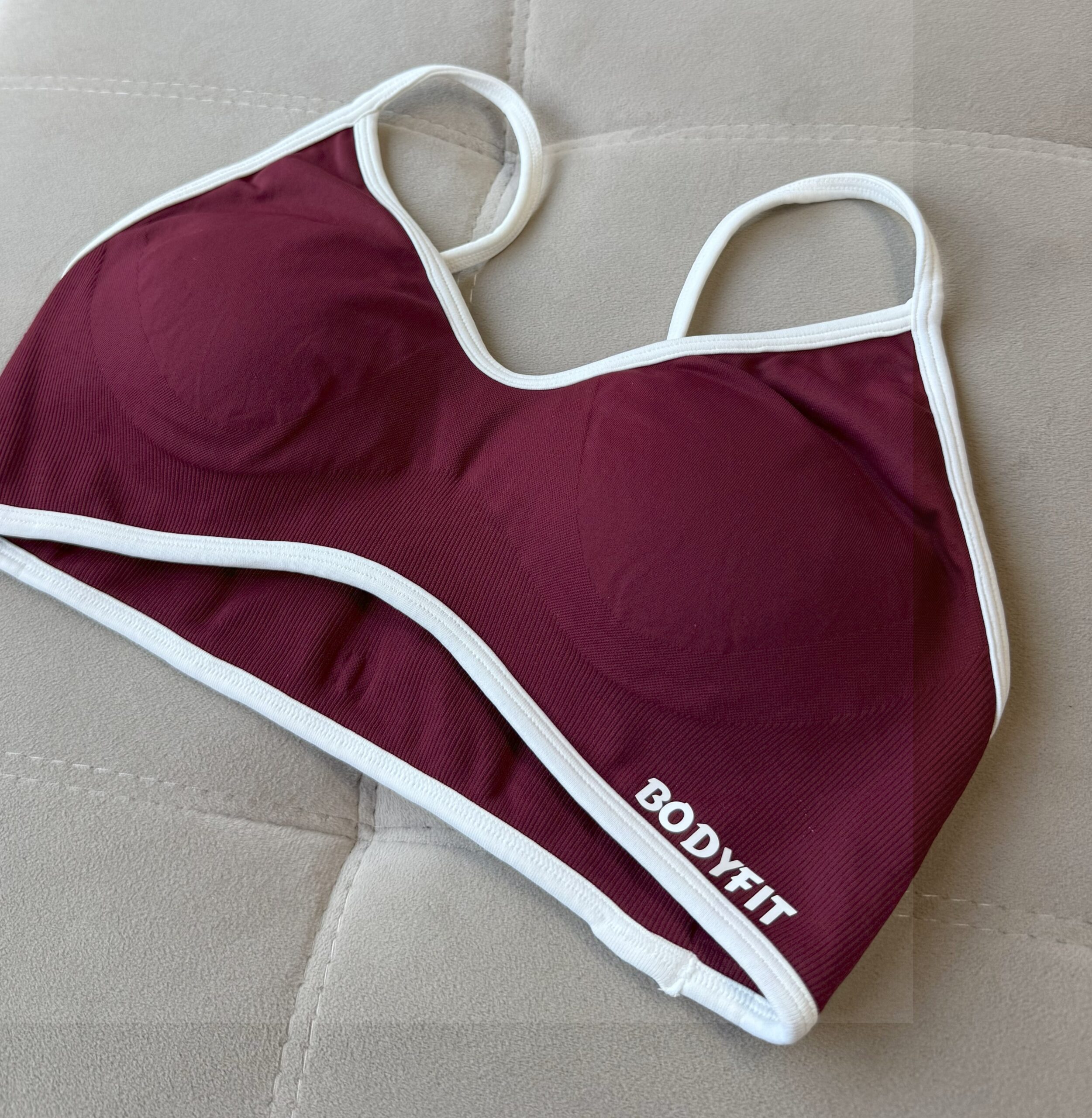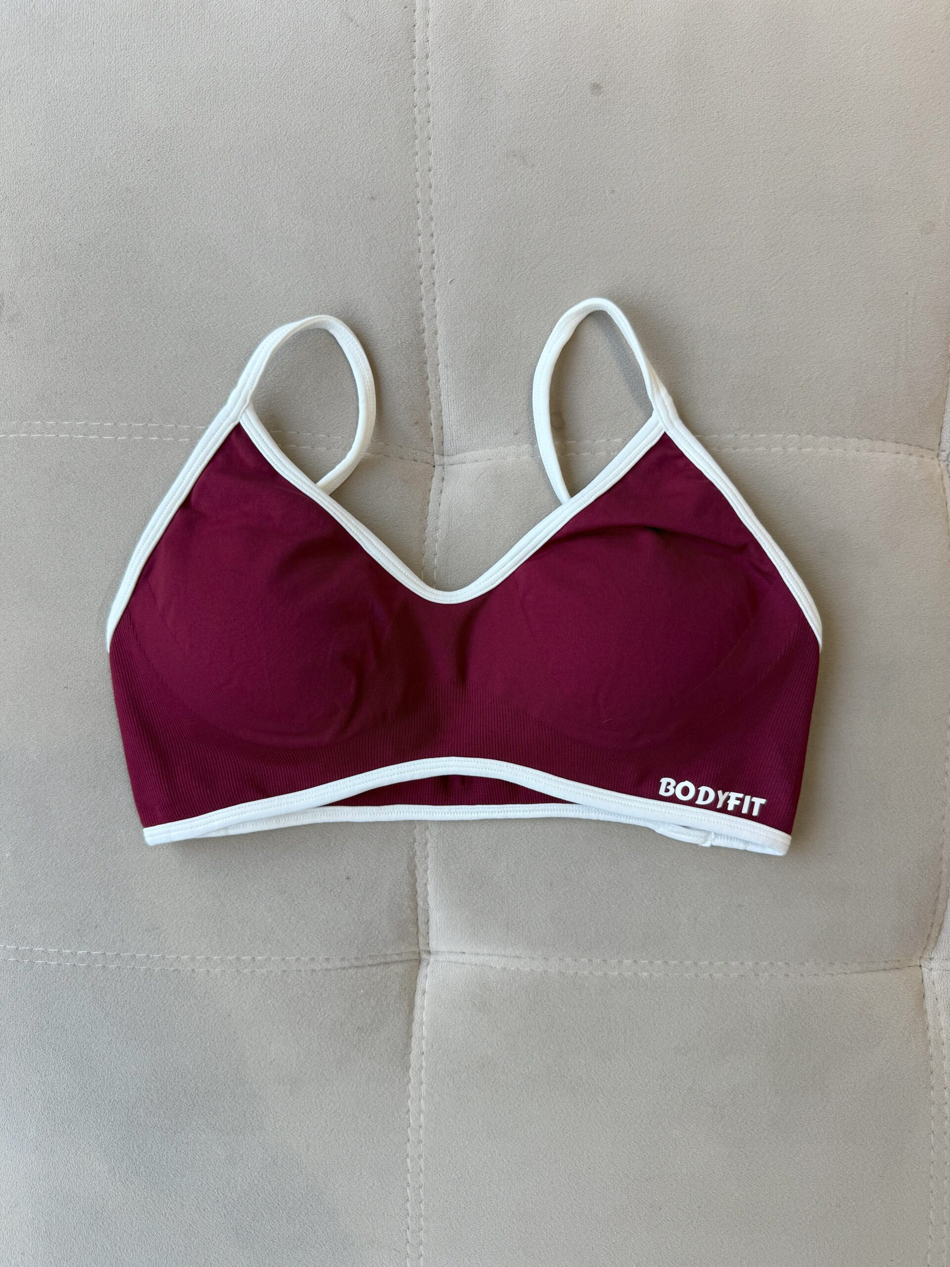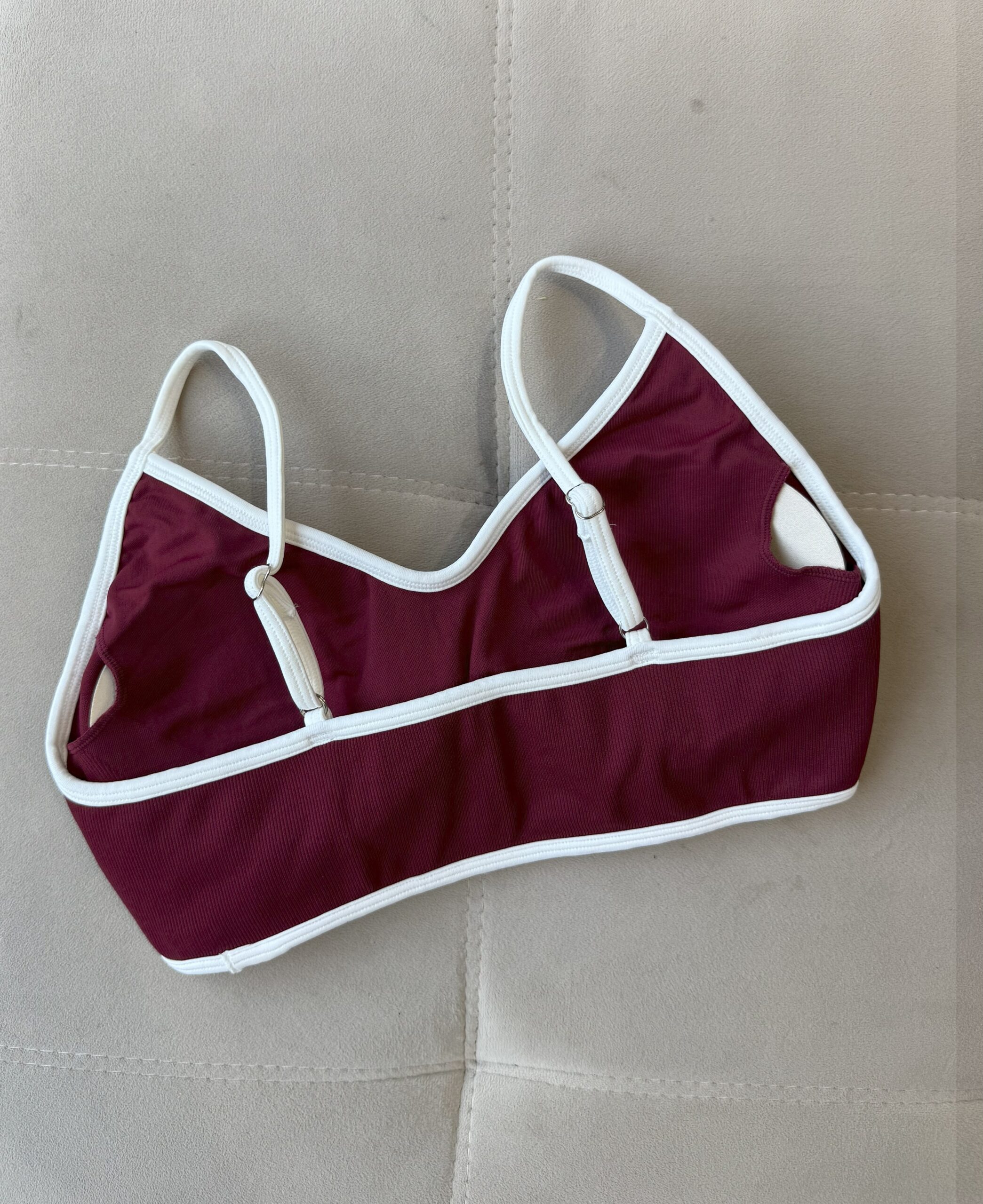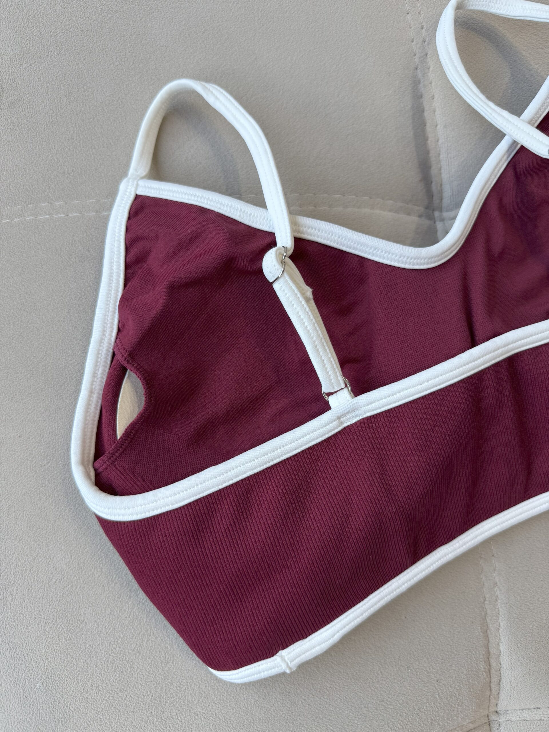 Su diseño bicolor en bordó profundo con bordes y breteles blancos aporta un contraste moderno y delicado que resalta el escote y la espalda. Ideal para usar tanto en el gym como en tus looks deportivos urbanos.